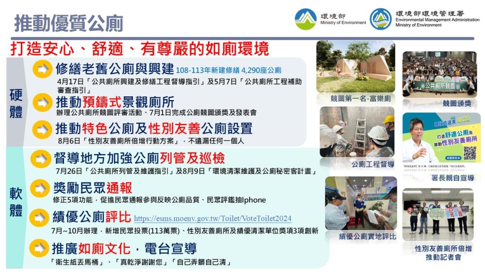 環境部環境管理署顏旭明署長致詞表示,2024年世界廁所日(World Toilet Day)主題為「廁所 和平之所」,環境部成立之後投注很大的資源改造公共廁所,提供一個安全、舒適、有尊嚴的如廁環境,因為公共廁所不僅是國家的門面,也是國人及國外旅客到我國各地旅遊時所能感受我國進步的象徵。因此,不管是廁所的新建修繕與維護,都是一項重要的工作,也是我們的使命,希望致力於改造公廁品質的同時,搭配正確有效地清潔維護管理,並且推廣如廁文化,向民眾宣導如廁禮儀,如養成自己弄髒自己清的習慣,留給下一個使用者乾淨的如廁環境,並在使用公廁遇到清掃人員時可以說一句「真乾淨,感謝您」表達我們的感激之意。