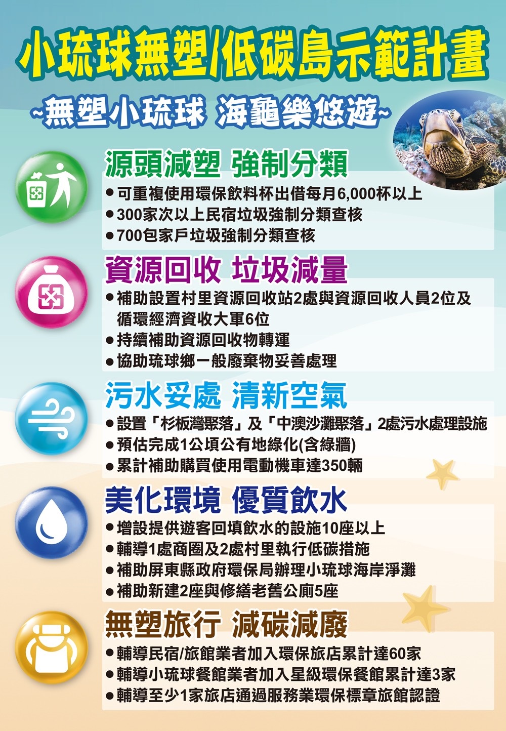 環保署今(23)天在臺北車站舉辦「無塑小琉球 綠蠵龜悠游小琉球無塑 低碳島示範計畫」啟動記者會,李應元署長宣布將推動為期2年期之「小琉球無塑 低碳島示範計畫」,其推動內容係包含源頭減塑強制分類、資源回收垃圾減量、污水妥處清新空氣、美化環境優質飲水、無塑旅行減碳減廢等5大主軸,並配合執行19項實施策略,希望透過推動當地居民與遊客由食、衣、住、行、育、樂等面向逐步落實塑膠減量的工作,建立環境友善的低碳永續經營模式,帶動小琉球無塑低碳觀光旅遊,創造經濟成長與生態保護的雙贏局面,讓綠蠵龜能擁有好「龜」宿。