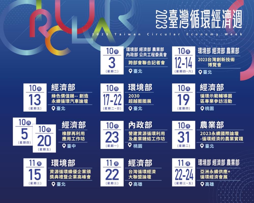 今年一系列活動包括經濟部10月5日及20日「橡膠再利用應用工作坊」、10月13日「綠色價值鏈 創造永續循環汽車論壇」、10月19日「循環示範輔導園區專業參訪活動」等,持續擴大資源循環公私交流。10月23日內政部辦理「營建資源循環利用及產業鏈結工作坊」、10月31日農業部辦理「2023永續國際論壇—循環經濟的農業實踐」,以營建與生物循環,帶動區域經濟永續發展。