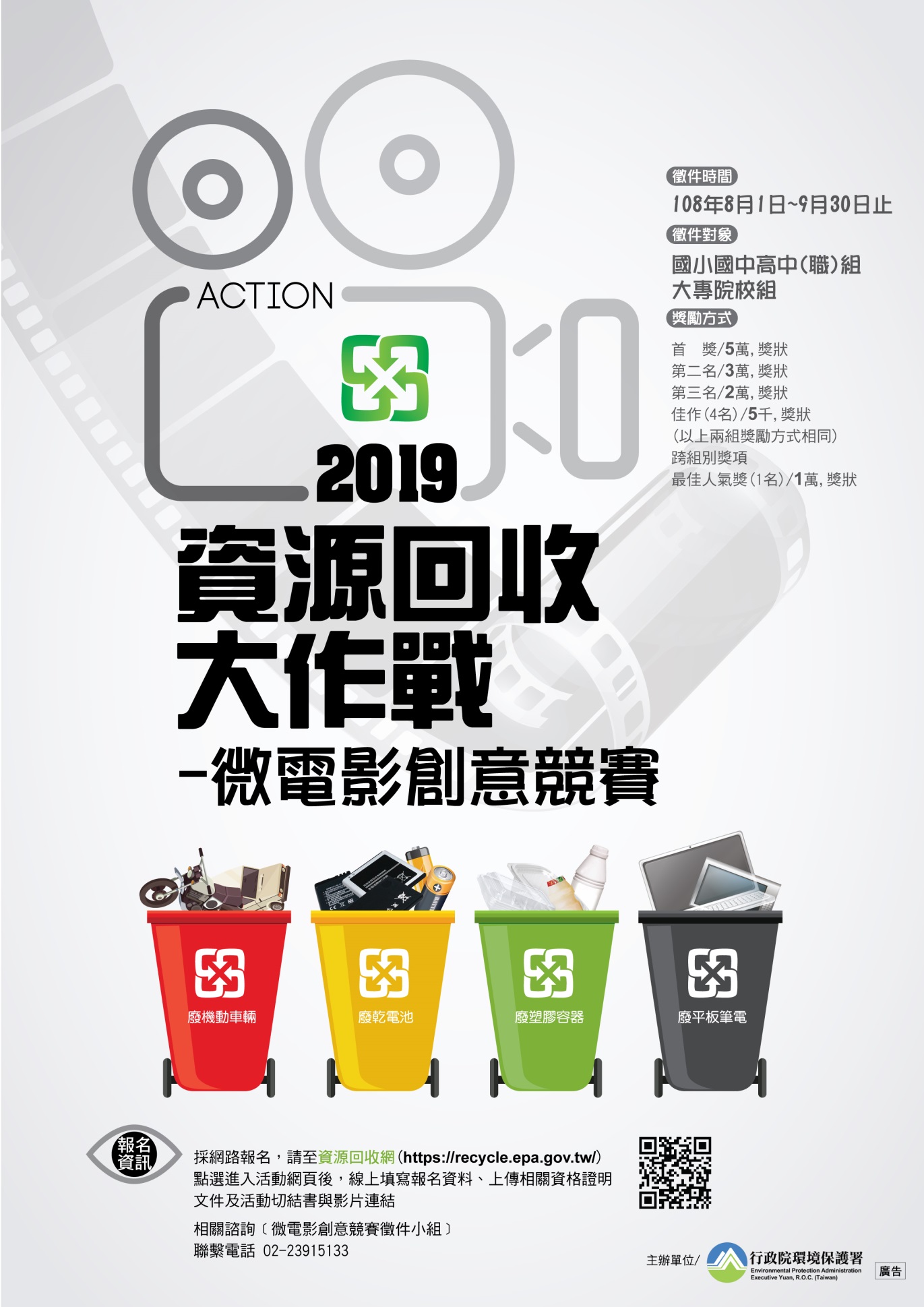 環保署自8月1日起至9月30日舉辦「2019資源回收大作戰微電影創意競賽」,將分「國小、國中及高中(職)組」及「大專院校組」等2組分開徵件比賽,總獎項高達新臺幣30萬元,歡迎青年學子,踴躍上網報名參加!