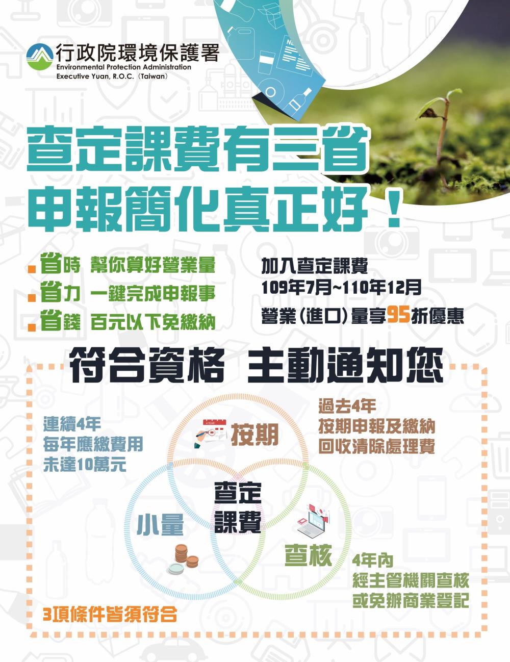 為簡化責任業者登記、申報作業,環保署修正發布「應回收廢棄物責任業者管理辦法」。自109年7月1日起,針對每年應繳金額在新臺幣10萬元以下之責任業者,環保署主動提供應申報繳費量(查定量)供責任業者一鍵申報;並為鼓勵責任業者使用,110年底前採用查定課費申報,查定量將採九五折核定。此外,核算結果全年應繳金額低於新臺幣100元者,還可以免繳納。
