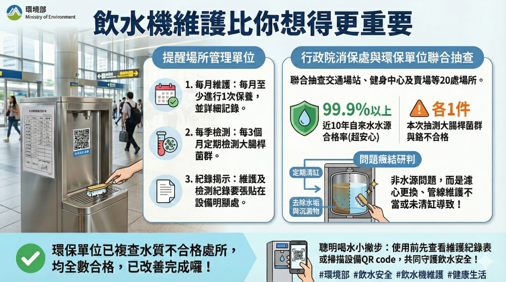 行政院消費者保護處上個月聯合環保機關辦理飲水機水質檢驗暨維護管理查核專案,針對交通場站、健身中心及賣場(或百貨公司)等20處場所查核,民眾最關心水質,大腸桿菌群及重金屬各有1處不合格,另部分場所維護管理未落實。環境部表示,已督促地方環保局依法查處並限期改善,該部強調,飲水機水源以自來水為水源,過去10年抽驗合格率達99%以上,設置飲水機如未確實維護,恐使水質不佳,故呼籲公私場所設置飲水機後,就要落實日常維護檢測,才能確保水質。