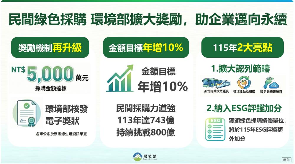 * 提升競爭力:綠色採購已成為企業競爭力的指標。臺灣證券交易所於114年10月底公告的「115年ESG評鑑」中,已正式將「獲頒環境部綠色採購績優單位」列為額外加分項目。此外,環境部已於公司治理中心網站上架「綠色採購揭露指引」,協助企業於編製永續報告書(ESG Report)時,能精準揭露綠色績效。