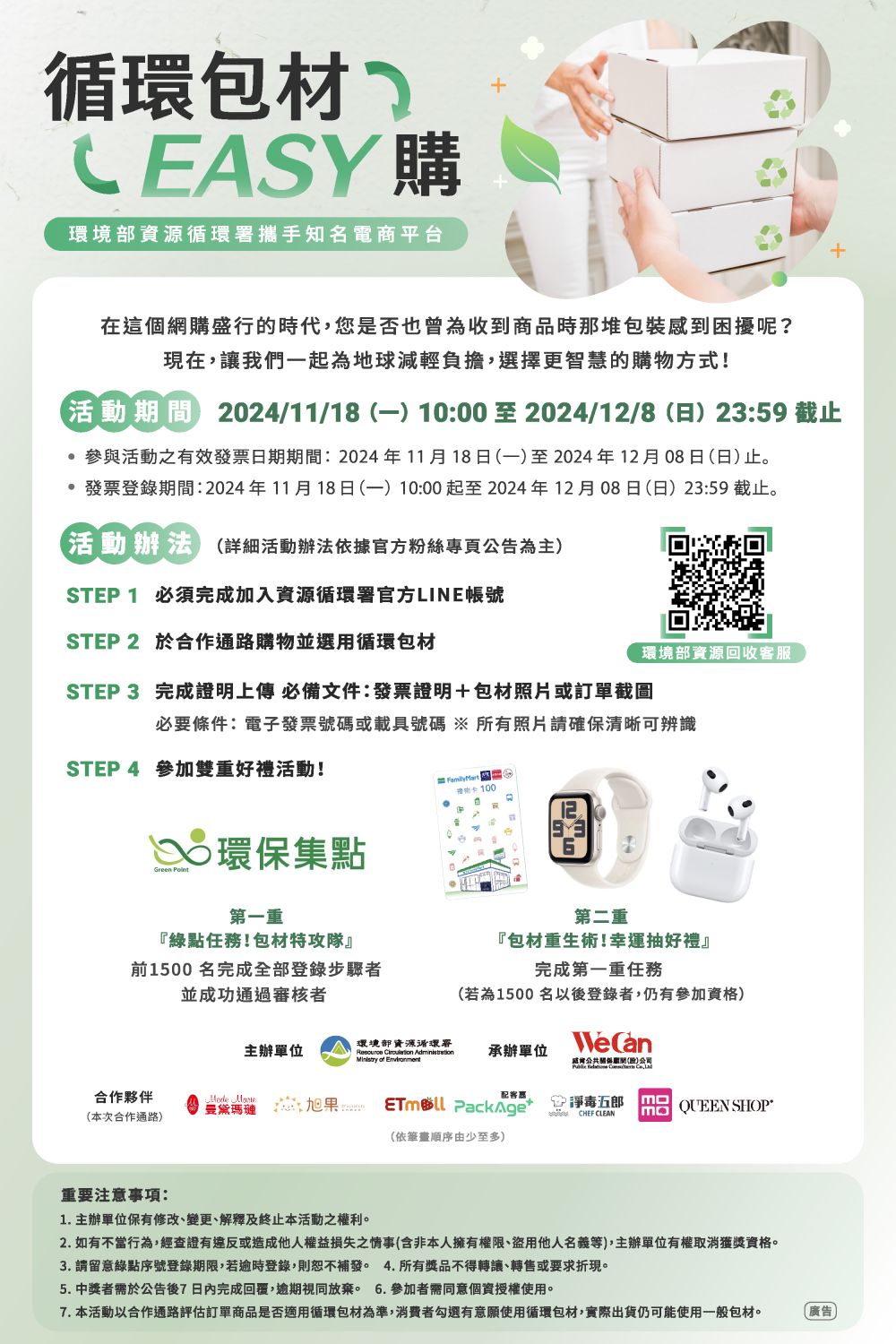 雙11購物節剛結束,環境部資源循環署為落實「網際網路購物包裝限制使用對象及實施方式」政策,緊接著與國內多家電商平台攜手推出「循環包材EASY購」活動,祭出高額綠點回饋,邀請全民一同參與減塑行動。