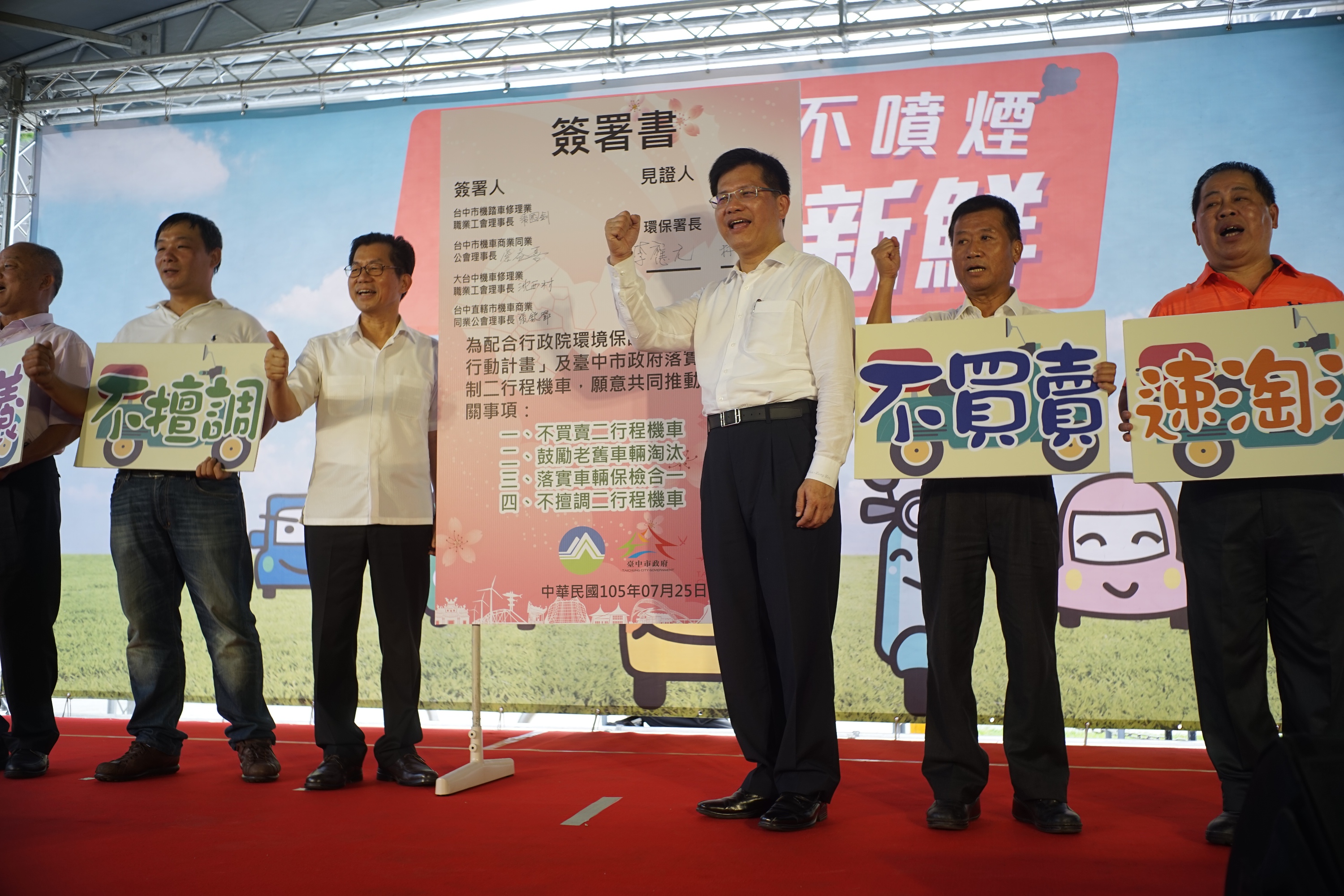 環保署今日與臺中市政府共同舉行「大車小車不噴煙、空氣好新鮮」記者會,宣示致力改善柴油車黑煙排放及向二行程機車說NO等措施,以有效減少車輛排煙,提升空氣品質,並促成PM2.5紅色警戒(當日PM2.5濃度≧54g/m3)發生率2年減少20%,4年減少50%。