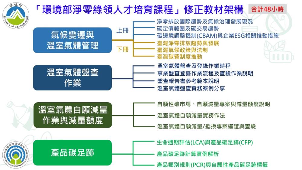 隨著歐盟全面推動「碳邊境調整機制(CBAM)」,加上我國碳費制度正式上路,碳排已從單純的環境議題,轉變為影響企業成本結構與競爭力的關鍵指標。為此,國環院指出,新版教材在維持48小時架構下,系統性解析CBAM與ETS的運作邏輯及產業的因應對策,並精準對接我國《氣候變遷因應法》相關規範,避免出現「國際一套、國內一套」的落差。此外,教材持續深耕溫室氣體盤查、自願減量及產品碳足跡等核心內容,全面賦能我國產業應對供應鏈減碳與轉型之挑戰。