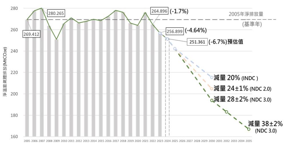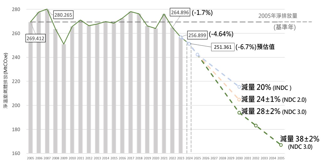 環境部表示,對抗氣候變遷需全球一起行動,我國已將2050淨零排放目標納入「氣候變遷因應法」,以五年為一期設定階段管制目標,並比照氣候公約締約方提出國家自定貢獻(NDC),2024年全球溫室氣體排放持續上升之際,我國已持續下降,2024年估計將比基準(2005)年減少6.7%,較2023年減少2.15%。