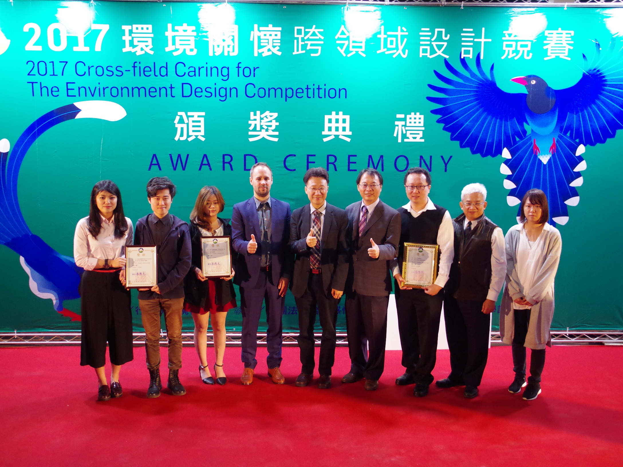 「2017環境關懷跨領域設計競賽」共計687稿件參與競賽,經過初審,共有20名作品進入決審,決審前3名分別是「尿布變黃金」「新型牡蠣養殖浮具」「危機變轉機-火災逃生急救口罩」。第1名可獲得獎金10萬元、第2名5萬元、第3名3萬元、佳作5名各5,000元。